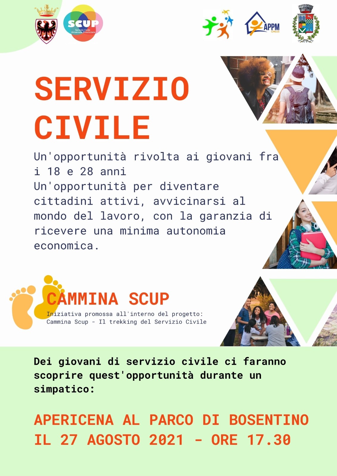 Venerdì 27 agosto a partire dalle ore 17.30 presso il parco di Bosentino ci sarà l’opportunità di conoscere le opportunità offerte dal servizio civile provinciale per giovani dai 18 ai 28 anni e per associazioni ed enti del territorio!